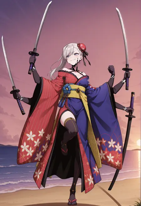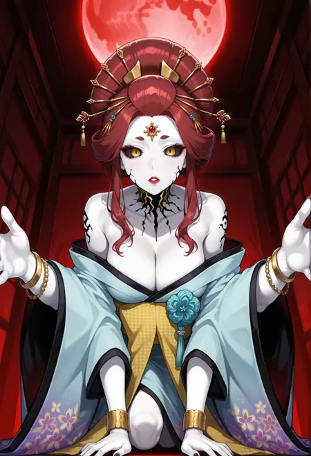 バリエーション: (追加腕:1.4)、1人娘、ドット眉、額の宝石、リップスティック、空虚な目、アイライナー、ブレスレット、赤髪、片結び、髪飾り、中国式髮簪、白肌、彩色肌、モンスターガール、汚染、体の模様、黄色い体の模様、黒い巩膜、黄色い目、黄色い帯、和服、青い着物、花柄のドレス