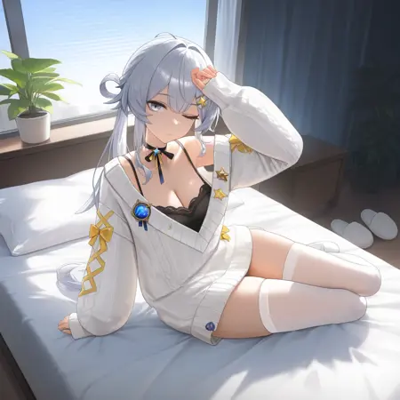 ZhimingAG, Zhm_Swt, long hair, grey hair, ponytail, braid, heterochromia, light purple eyes, grey eyes, white sweater, sweater dress, single off shoulder, black camisole, camisole, neck ribbon, black ribbon, puffy sleeves, sleeves past wrists, star (symbol), star brooch, jewelry, star hair ornament, yellow ribbon, yellow bow, white thighhighs, thighhighs, single bare shoulder, brooch, ribbed sweater, cable knit,