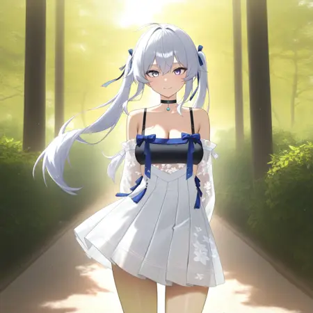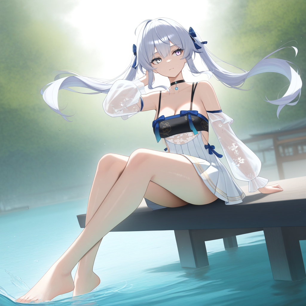 ZhimingAG, Zhm_Plt, twintails, grey hair, long hair, heterochromia, light purple eyes, grey eyes, pleated dress, straped dress, black strap, spaghetti strap, see-through, white skirt, pleated skirt, side cutout, blue bow, blue ribbon, detached sleeves, see-through sleeves, puffy long sleeves, alt white sleeves, floral print, black top, black choker, choker pendant, hair bow,