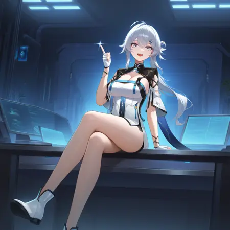 ZhimingAG, Zhm_Def, grey hair, long hair, short dress, white dress, heterochromia, sleeveless dress, light purple eyes, grey eyes, black shrug, shrug (clothing), blue stole, cleavage cutout, chinese clothes, side slit, black shorts, short shorts, shorts under dress, yellow tassel, gold trim, hairclip, arm cutout, side sleeves, white sleeves, short sleeves, white gloves, fingerless gloves,