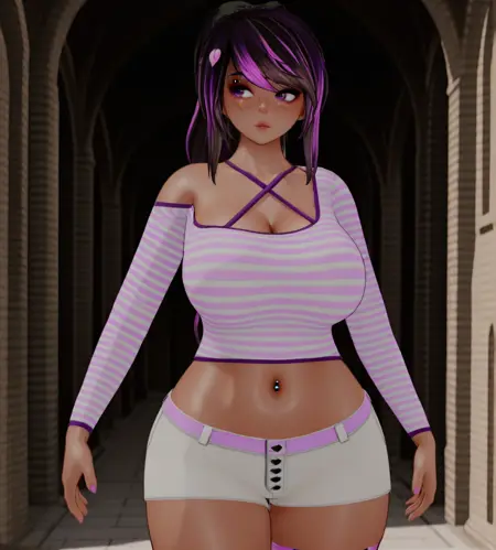 縞模様のシャツ、紫の縞、ショートトップ、クロスハルター、ツートーンシャツ、非対称の袖、