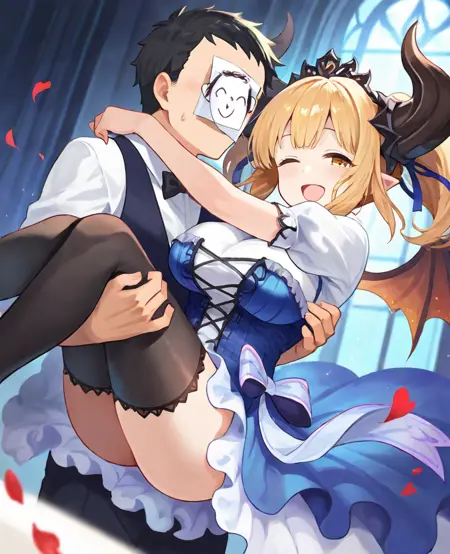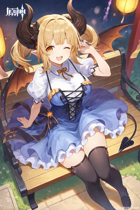 blonde hair , horns , ( short ) twintails , hair ornament , yellow eyes , wings , ( spade ) tail ;