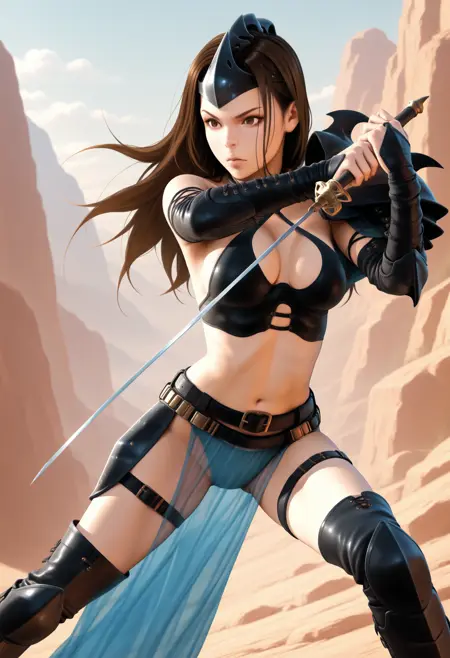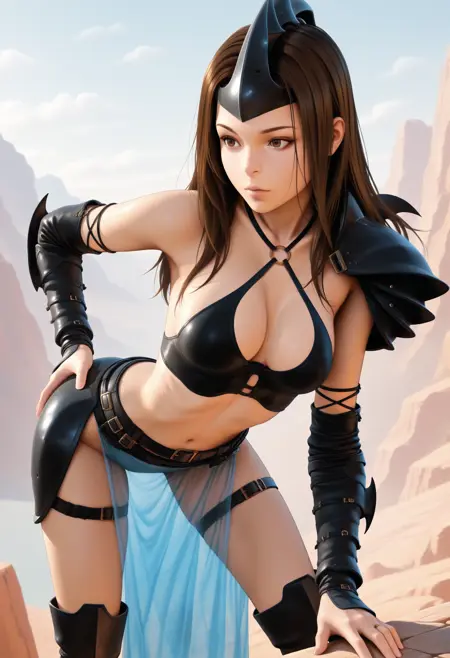 black leather halter top, helmet, belt, single tasset, single pauldron, translucent loincloth, panties, armored bracers