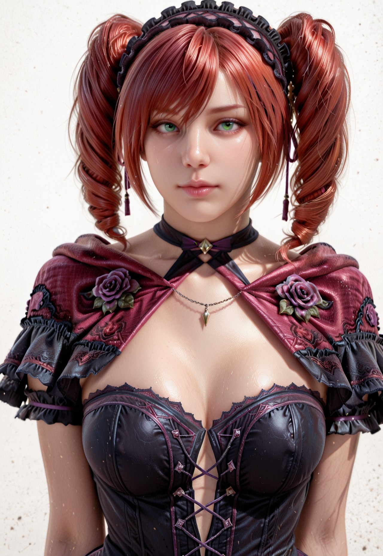 use tags like " Amy Sorel, soul calibur 6, gothic, gothic hairband, red hair, green eyes, drill twintails, lips, dress, panyhose