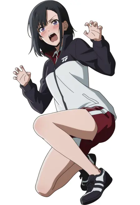 multicolored jacket, high collar, black jacket, white jacket, red shirt, collared shirt, gym shorts, short shorts, multicolored shorts, white shorts, red shorts,