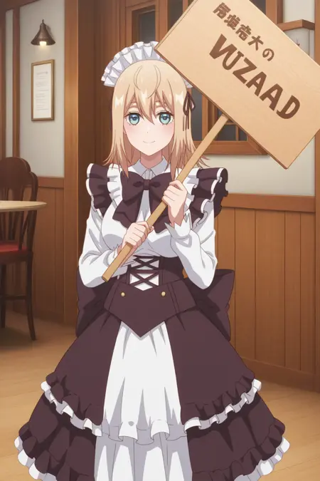 aaolivia, blue eyes, blonde hair, oliviamaid, maid headdress, black bowtie, white dress, long sleeves, black corset, underbust corset, maid apron, waist apron, back bow, black skirt, layered skirt, anime coloring,