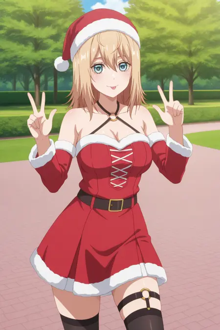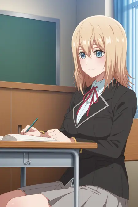 aaolivia, blue eyes, blonde hair, oliviaschool, red neck ribbon, white dress shirt, black blazer, grey skirt, pleated skirt, anime coloring,