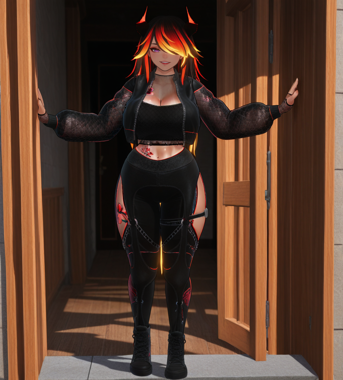 | 训练词汇 | sophie(vrchat),multicolored hair,gradient hair,black hair,red hair,orange hair,yellow hair, dark-skinned female, long hair,bangs,parted bangs, hair over one eye, sidelocks, purple eyes, two-tone horns,red horns,black horns, fishnet top,black top,crop top, black jacket,see-through jacket, fingerless gloves,black gloves,lace gloves, thigh cutout,black pants,leggings,chain, black boots,lace-up boots, tattoo,flower tattoo, chest tattoo,leg tattoo, stomach tattoo,已复制! |
