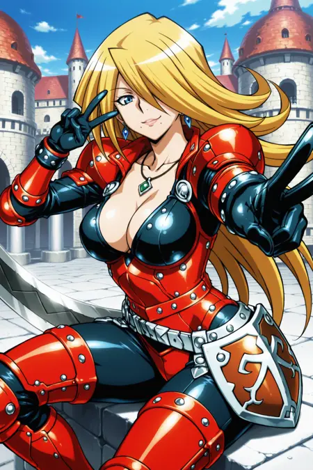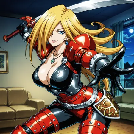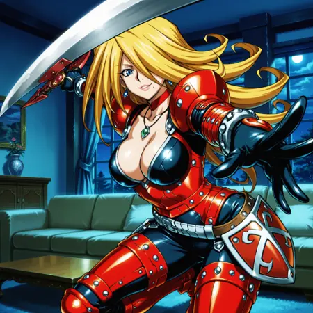 yugioh_card_style, yugioh_card_for_x_saber_anu_piranha, 입 밑에 한 개의 점, 한쪽 눈 위의 머리카락, 파란 눈, 금발, 긴 머리, 입술, 귀걸이, 목걸이, 팔찌, 큰 가슴, 어깨뼈, 가슴 사이의 틈, 미소, 빨간 갑옷 바디수트, 분할된 가슴판, 검은 가슴판, 빨간 다리 갑옷, 못 박힌 허벅지 보호대, 갑옷 벨트, 테크 갑옷이 달린 벨트, 엉덩이 방어판, 유연한 뱀 칼 들고 있음