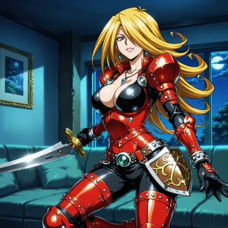 yugioh_card_style, yugioh_card_for_x_saber_anu_piranha, one mole under mouth, hair over one eye, blue eyes, blonde hair, long hair, lips, earrings, necklace, bracelets, large breasts, collarbone, cleavage, smile, red armored bodysuit, segmented chestplate, black breastplate, red leg armor, studded thigh guards, armored belt, belt with tech armor, hip shield, holding flexible snake sword