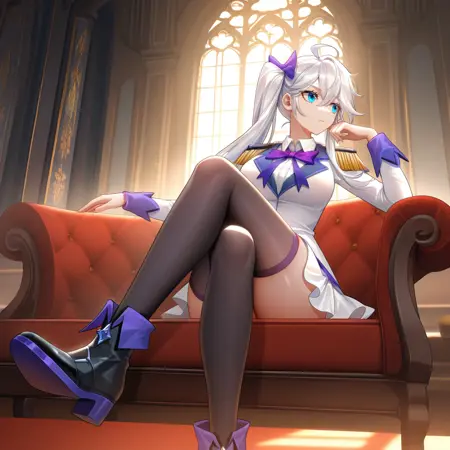 MengHongchen, Mng_Def, long hair, blue eyes, white hair, side ponytail, ahoge, school uniform, white jacket, collared jacket, purple bow, white shirt, collared shirt, frilled skirt, white skirt, epaulettes, white sleeves, long sleeves, blue sleeve cuffs, light blue bow, hair bow, black thighhighs, purple trim,