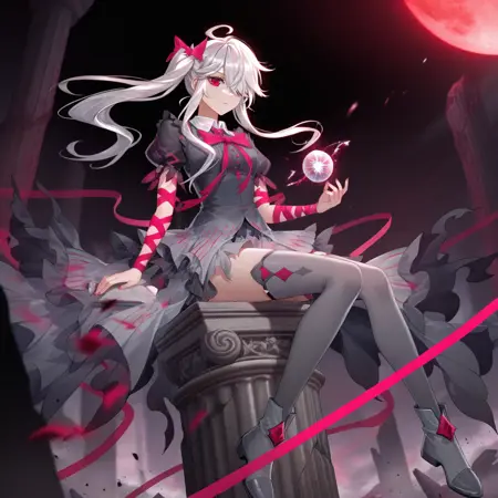 MengHongchen, Mng_Alt, long hair, red eyes, white hair, side ponytail, collared dress, gradient dress, grey dress, white collar, pink bow, ribbon bow, long ribbon, criss-cross straps, torn dress, arm strap, frilled dress, cross-laced armwear, arm ribbon, red strap, red bow, hair bow, torn skirt, black sleeves, puffy short sleeves, grey thighhighs, thighhighs, grey skirt,