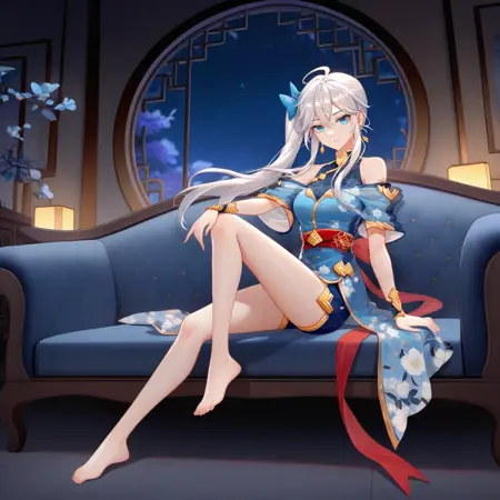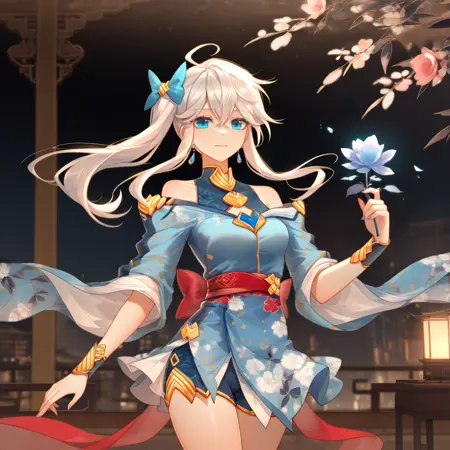 MengHongchen, Mng_CN, long hair, blue eyes, white hair, side ponytail, ahoge, chinese clothes, off-shoulder dress, light blue dress, sleeveless shirt, bare shoulders, dark blue shirt, light blue kimono, red sash, dark blue shorts, shorts under dress, gold trim, jewelry, blue bow, hair bow, wide sleeves, wrist cuffs, earrings, floral print,