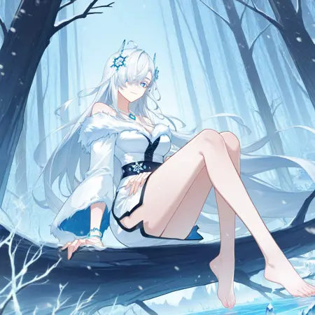 Xuedi, Xue_2nd, white hair, blue eyes, very long hair, colored eyelashes, hair over one eye, cleavage, japanese clothes, off-shoulder kimono, short kimono, fur collar, white kimono, snowflake print, fur-trimmed kimono, fur trim, wide sleeves, alt white sleeves, sleeves past elbows, black trim, black sash, pearl necklace, snowflake hair ornament, side slit, light blue gem, bracelet,