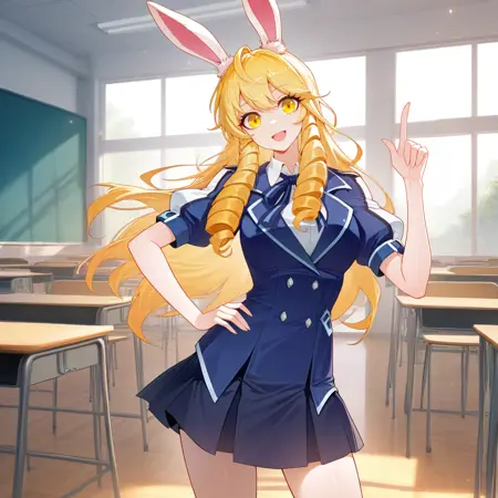 iangNannan, Jnn_2nd, yellow eyes, animal ears, blonde hair, long hair, drill sidelocks, dark blue ribbon, neck ribbon, drill hair, rabbit ears, collared shirt, white shirt, puffy short sleeves, two-tone sleeves, blue jacket, jacket, closed jacket, buttons, school uniform,