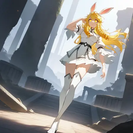 JiangNannan, Jnn_4th, yellow eyes, animal ears, blonde hair, long hair, drill hair, cleavage cutout, dress, white dress, white puffy sleeves, sleeve garter, wide sleeves, pleated skirt, white skirt, black belt, white footwear, thigh boots, high heel boots, rabbit ears, drill sidelocks, grey trim,