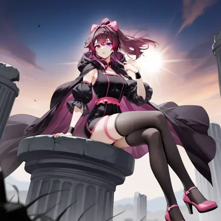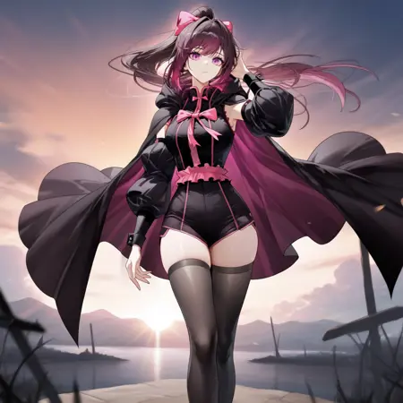 TangYa, Tgy_2nd, 茶色の髪, 紫色の髪, ポニーテール, 紫色の目, 高めのウエストショートパンツ, 黒いショートパンツ, ピンクのトリム, 黒いシャツ, ショルダーレスシャツ, ピンクのリボン, 胸元のリボン, ピンクのサッシュ, フード付きのマント, 黒いマント, 黒いカーディガン, 両面カーディガン, 黒いハイソックス, ハイソックス, ピンクの太ももストラップ, フリルのあるサッシュ, 髪のリボン, フリル付きの外れた袖, 黒い袖, 黒い手首の cuffs,