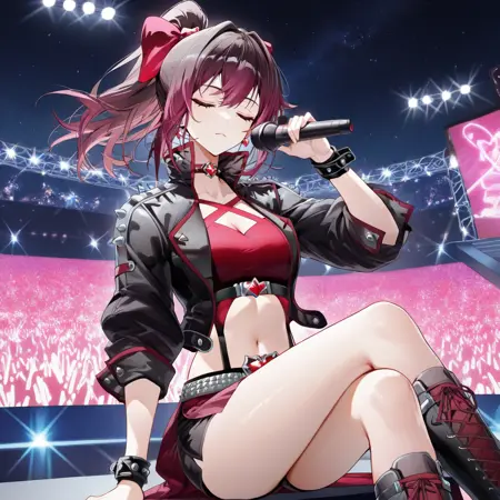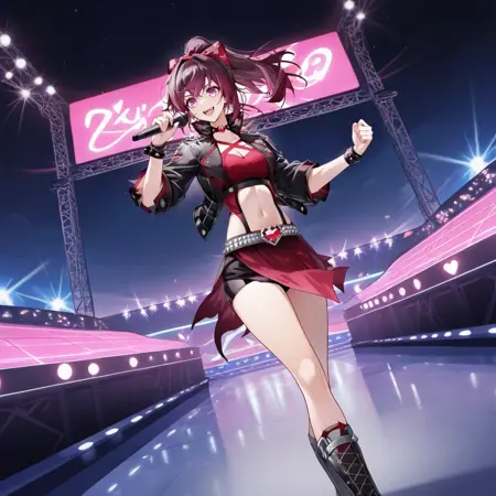 TangYa, Tgy_4th, 茶色の髪, 紫色の髪, ポニーテール, 紫色の目, レザーのジャケット, 開いたジャケット, 黒いジャケット, クロップドジャケット, サスペンダー, ナット付きベルト, 赤い宝石, ハート型の宝石, 赤いクロップドトップ, クロップドトップ, 交差するストラップ, 胸元, 赤いチョーカー, 赤いトリム, 赤いスカート, ミニスカート, サイドスリット, 黒いショートパンツ, マイクロショーツ, アンダーバスト, スカート下のショーツ, スパイク, スパイク付きリストバンド, 手首ベルト, ロールアップされた袖, 高いカラー, へそ, 中腹, 赤いリボン, 髪のリボン,