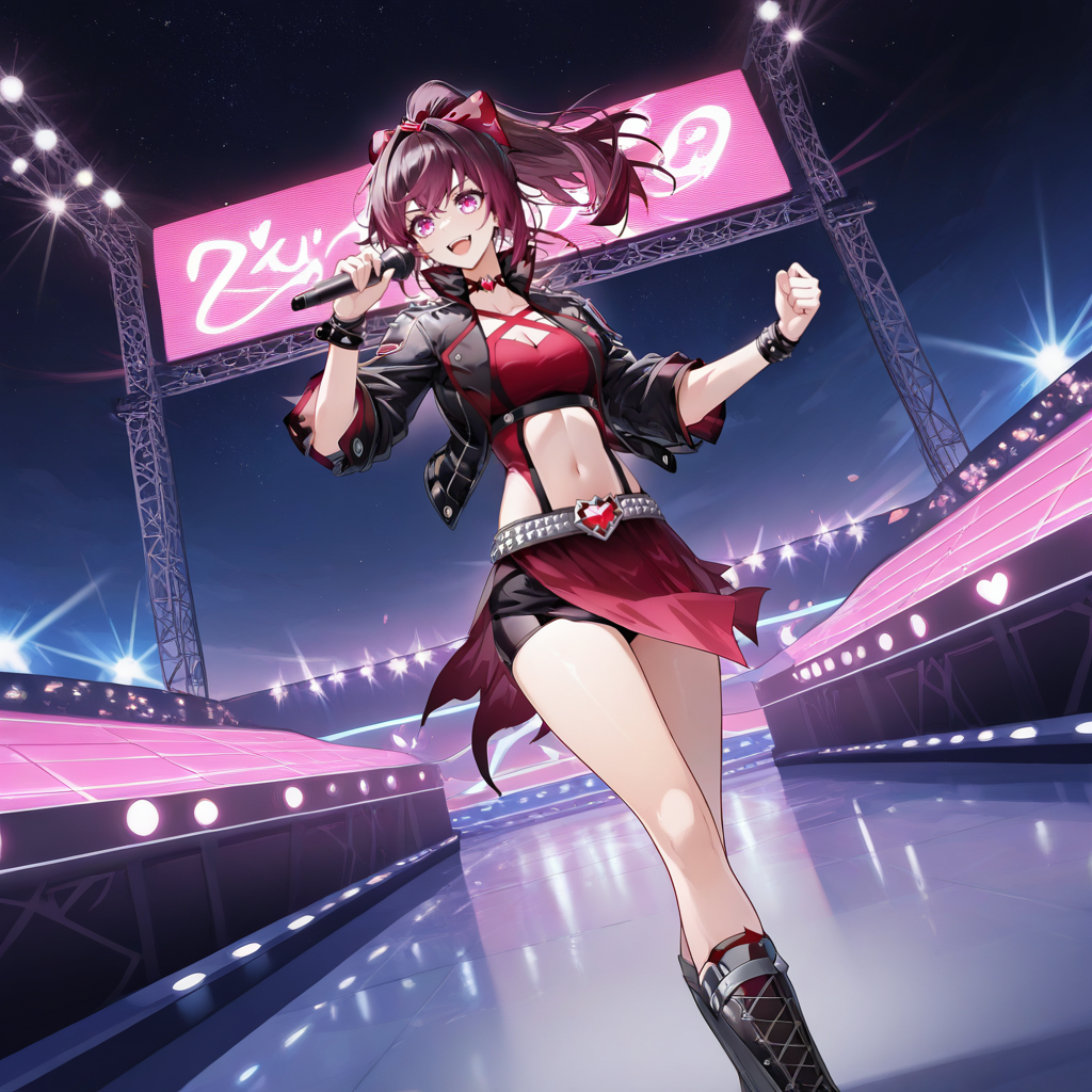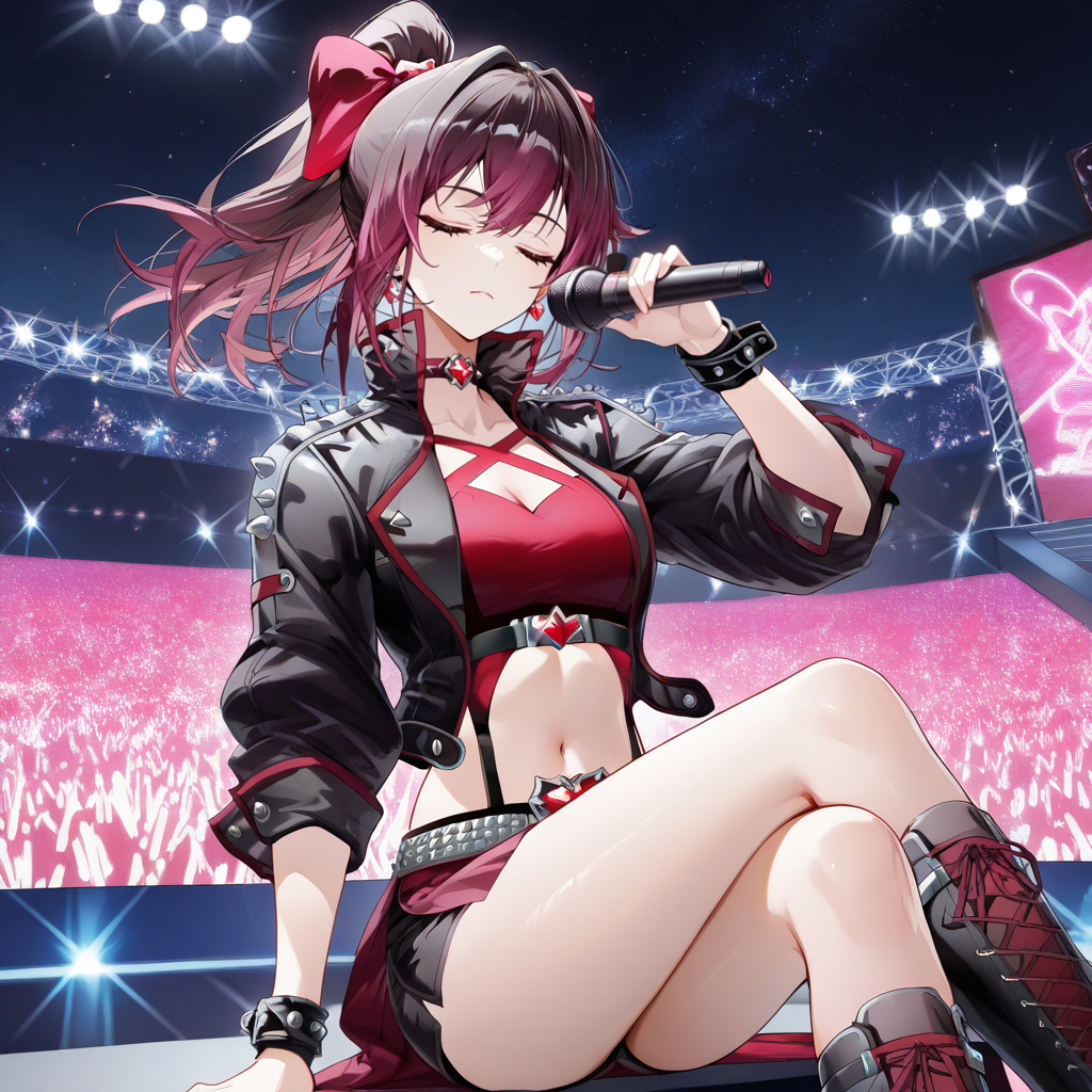 TangYa, Tgy_4th, brown hair, purple hair, ponytail, purple eyes, leather jacket, open jacket, black jacket, cropped jacket, suspenders, studded belt, red gem, heart-shaped gem, red crop top, crop top, criss-cross straps, cleavage, red choker, red trim, red skirt, miniskirt, side slit, black shorts, micro shorts, underbust, shorts under skirt, spikes, spiked wristband, wrist belt, rolled-up sleeves, high collar, navel, midriff, red bow, hair bow,