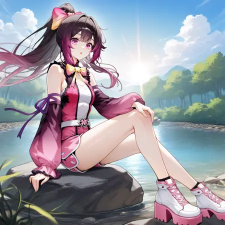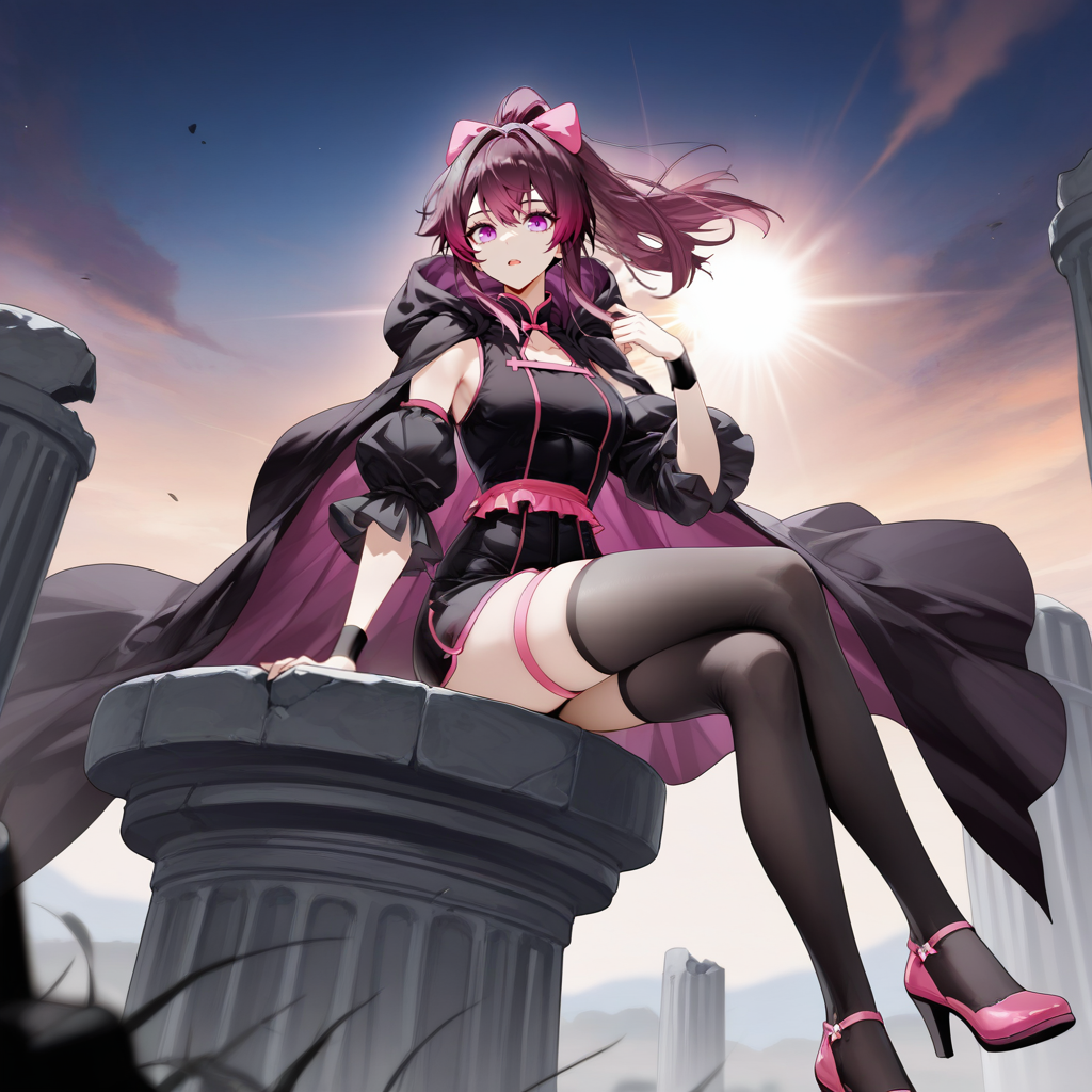 TangYa, Tgy_2nd, brown hair, purple hair, ponytail, purple eyes, high-waist shorts, black shorts, pink trim, black shirt, sleeveless shirt, pink bow, chest bow, pink sash, hooded cloak, black cloak, black cape, two-sided cape, black thighhighs, thighhighs, pink thigh strap, frilled sash, hair bow, puffy detached sleeves, black sleeves, black wrist cuffs,