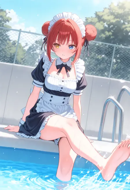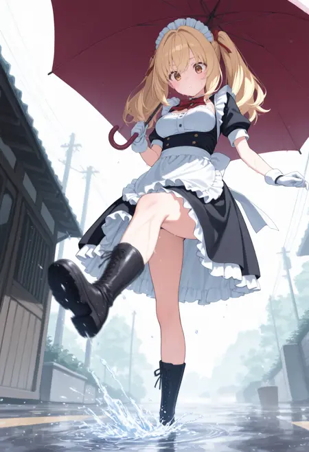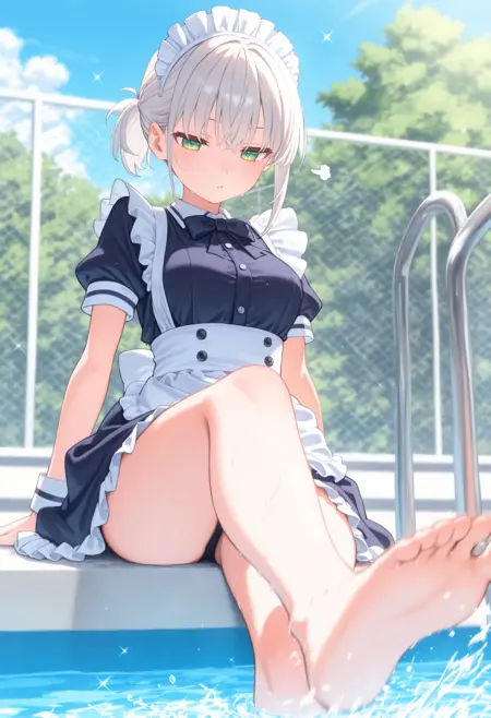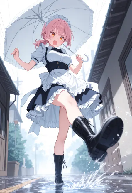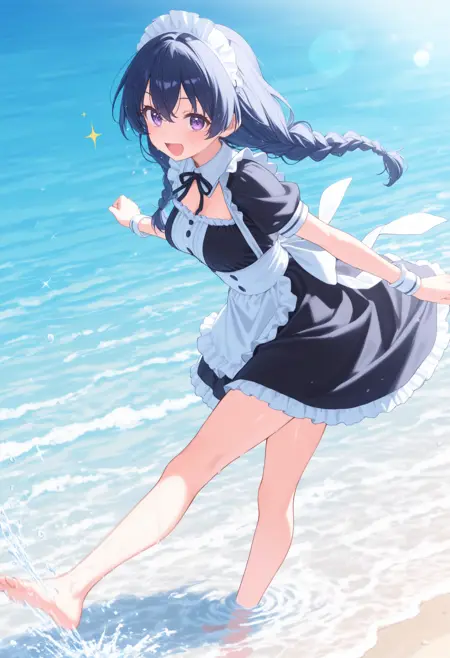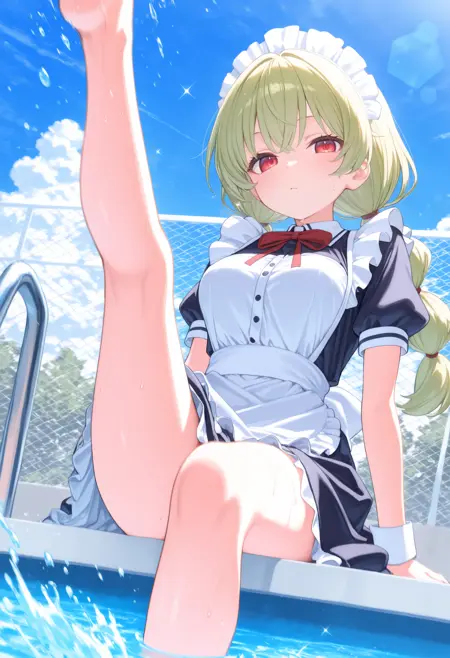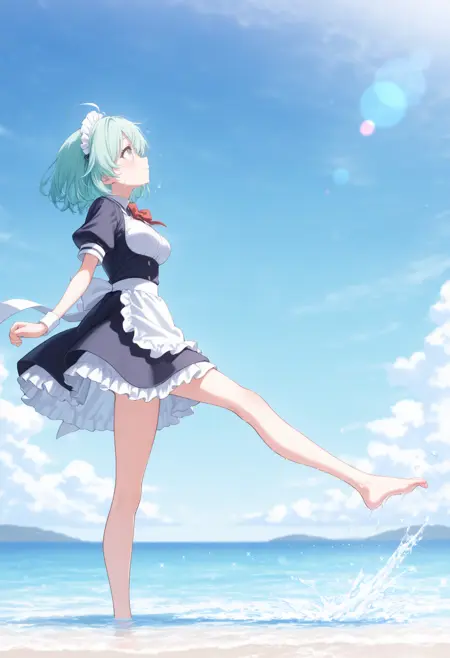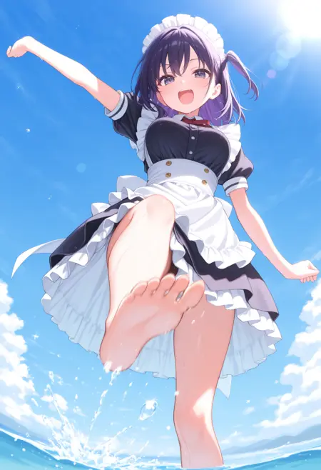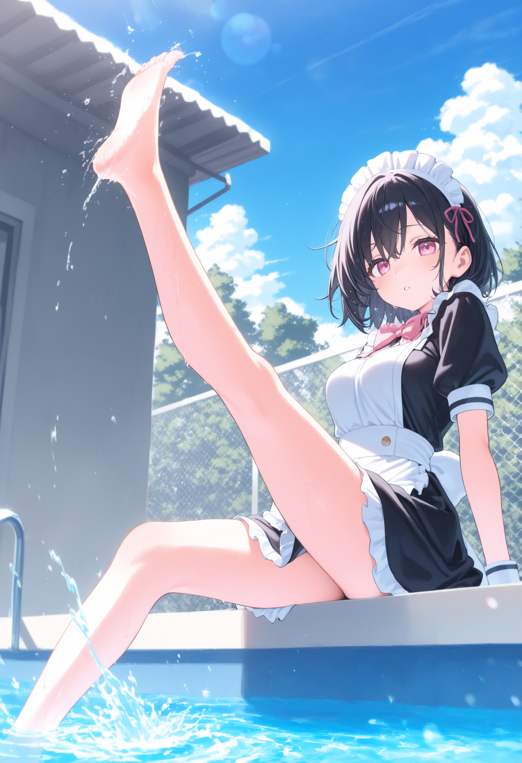트리거만으로도 포즈와 물받이가 생성되지만, 상황이 너무 모호하므로 수영장, 바다, 웅덩이 등의 물을 지정하고, "splashing", "water", "leg up", "motion blur", "kicking", "water drop", "outstretched leg", "wading" 등의 표현은 원하는 대로 추가해 주세요.