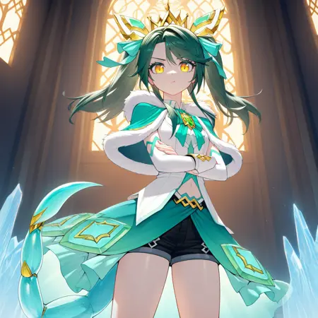 Bingdi, Bng_2nd, 어두운 녹색 머리카락, 트윈테일, 노란 눈, 긴 머리, 검은 샌드, 짧은 반바지, 전갈 꼬리, 털 장식 캐플레, 청록색 캐플레, 청록색 스커트, 프릴 스커트, 배꼽 컷아웃, 소매 없는 재킷, 흰색 재킷, 녹색 보석, 흰색 팔 보호대, 흰색 분리형 소매, 머리 리본, 단일 손목 보호대, 금색 머리 장식, 미니 왕관, 보석, 보석 머리 장식, 녹색 브로치, 머리 리본, 청록색 리본, 어두운 녹색 머리카락, 색상 있는 속눈썹, 십자 끈 부츠, 흰색 신발,