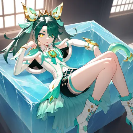 Bingdi, Bng_1st, 어두운 녹색 머리카락, 트윈테일, 노란 눈, 긴 머리, 칼라 셔츠, 전갈 꼬리, 꼬리, 중앙 프릴, 프릴 셔츠, 흰색 셔츠, 어깨 노출, 소매 없는 셔츠, 녹색 캐플레, 캐플레, 녹색 보석, 장신구, 녹색 리본넥타이, 녹색 스커트, 레이어드 스커트, 분리형 소매, 허리 캐프, 흰색 소매, 긴 소매, 비대칭 소매, 녹색 리본, 손목 리본, 머리 장식, 갈색 허벅지 양말, 십자 끈, 기스터 끈, 어두운 녹색 머리카락, 왕관, 티아라,