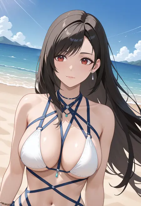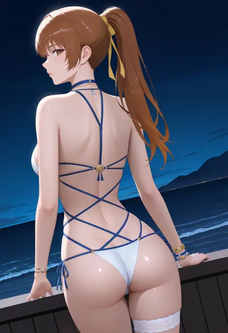 기본 프롬프트: "RaiseTheSail_Doaxvv,choker,white bikini,strappy bikini, blue straps, halterneck,sideboob,jewelry,bracelet,side-tie bikini bottom,white lace garter,white garter ring,white footwear,high heels"
