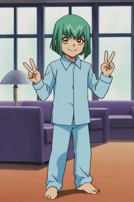 아이템 2: 남성, 녹색 머리카락, 밥 컷, 노란 눈, 녹색 눈, 파자마, 파자마 상의, 파자마 바지, 맨발