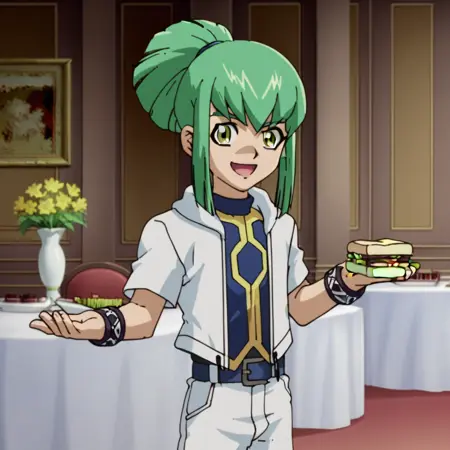 아이템 1: 남성, 녹색 머리카락, 사이드락, 앞머리, 포니테일, 노란 눈, 녹색 눈, 재킷, 벌어진 옷, 파란색 안셔츠, 팔찌, 보석, 벨트, 반바지, 신발