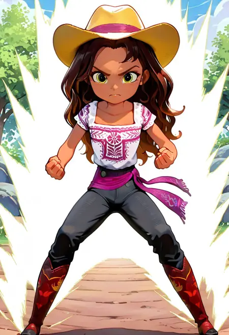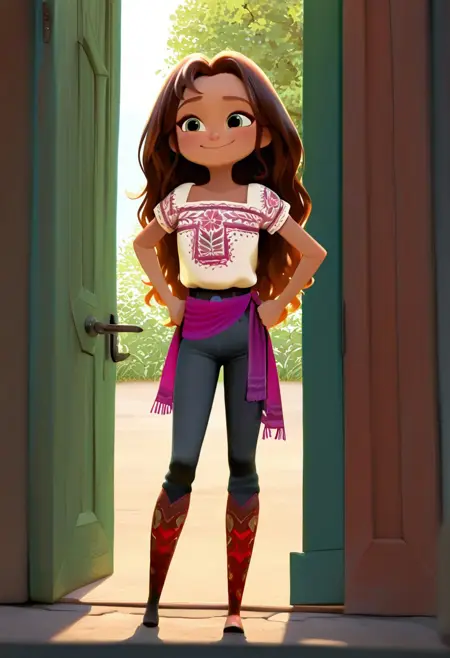 rural clothing, mexican-style embroidered blouse, white blouse, short-sleeved white blouse with pink embroidery, blouse tucked into pants,purple waist sash, cowboy boots,dark red decorative leather boots, heart and flame patterns on boots, black jeans