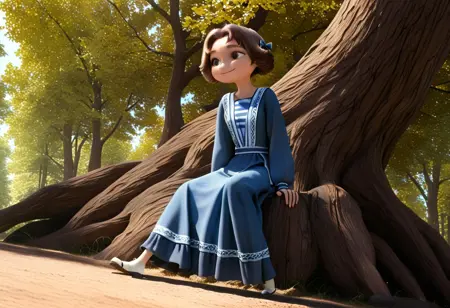 long blue dress, long sleeves, white and blue striped collar, decorative white patterns on chest part, waist belt, white and black shoes,