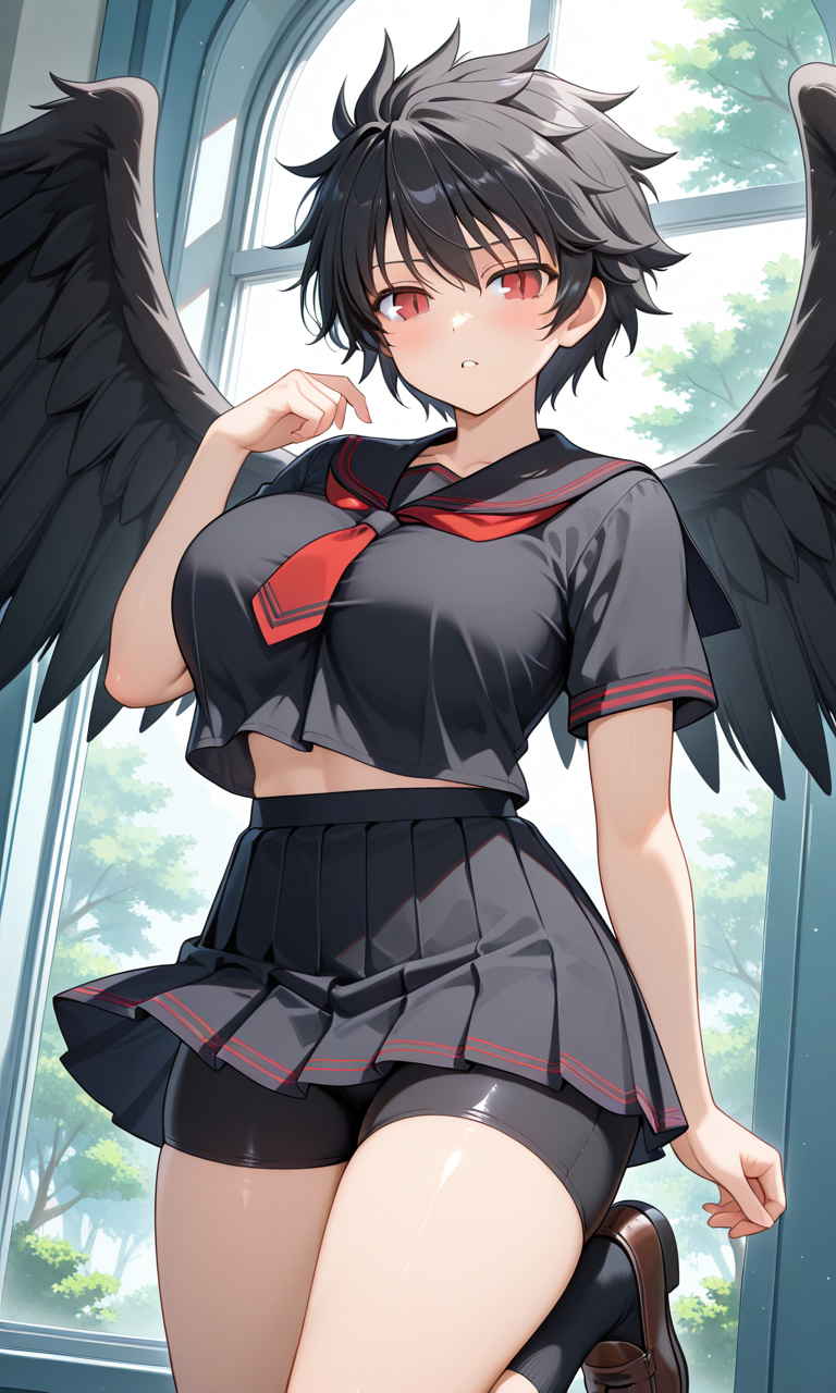 美雅_へびじょ、学校制服、赤いストライプのパイピング、黒いセーラー襟、黒いネクタイ、黒いセラフク、黒いシャツ、短い袖、黒いスカート、プリーツスカート、自転車用ショートパンツ、黒いレッグウェア、茶色のローファー
