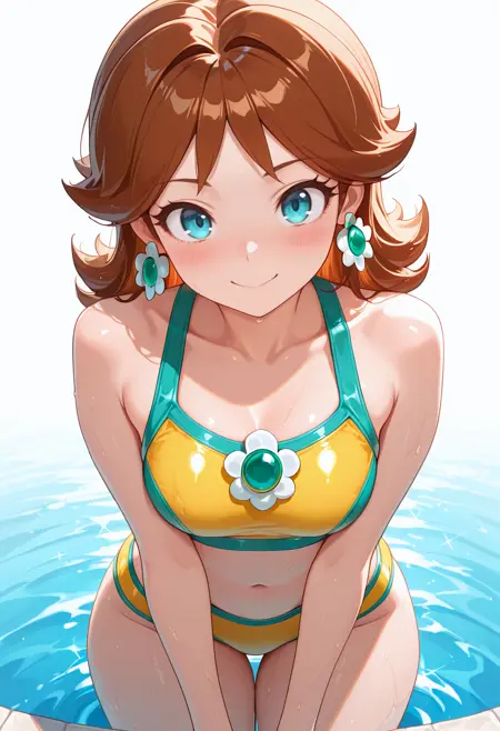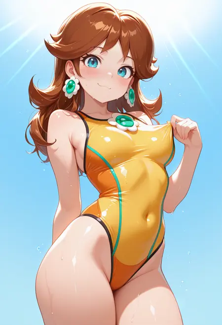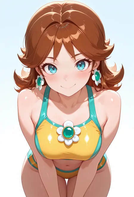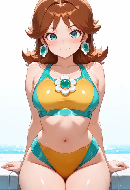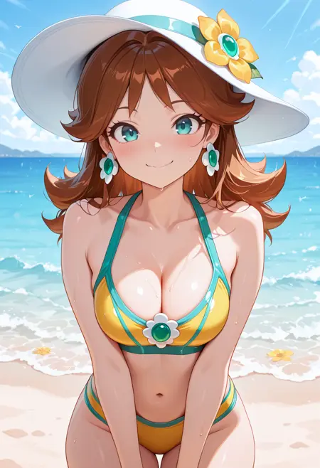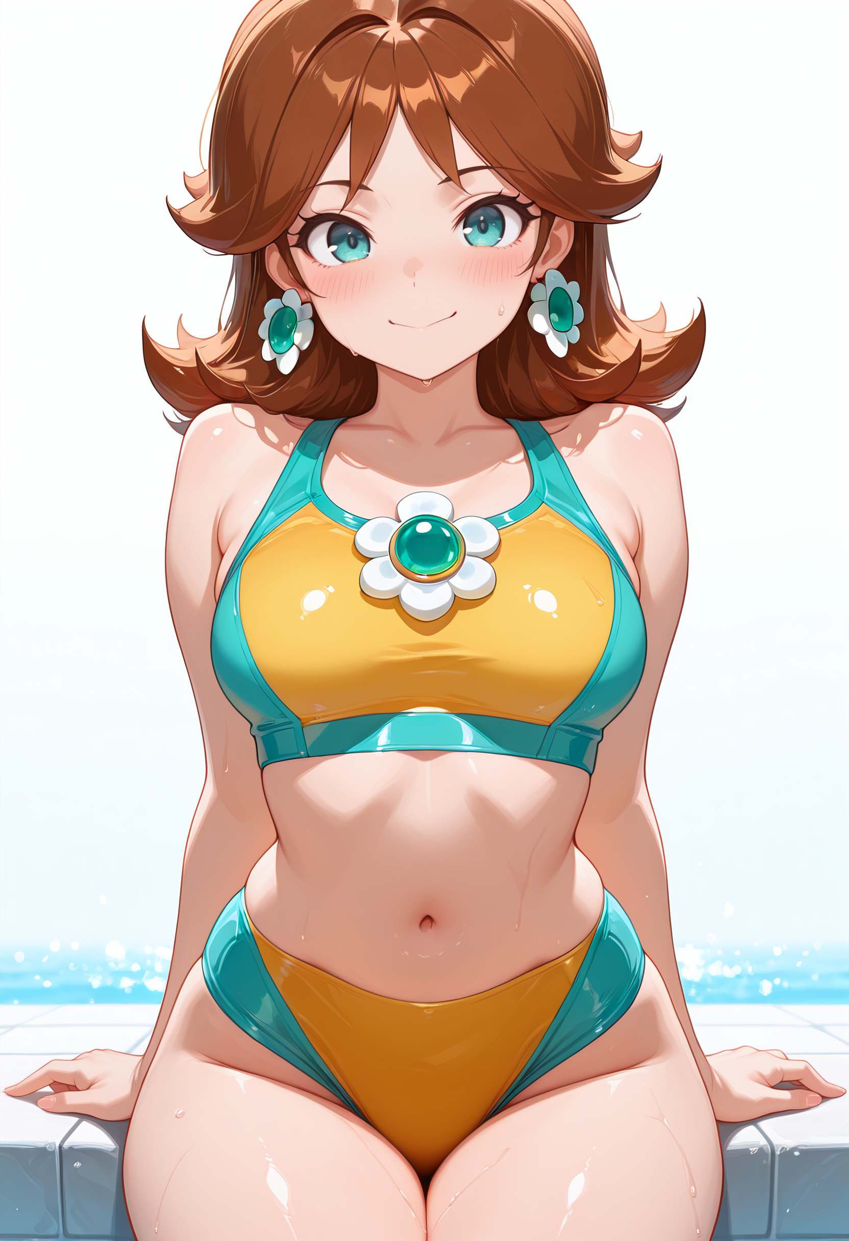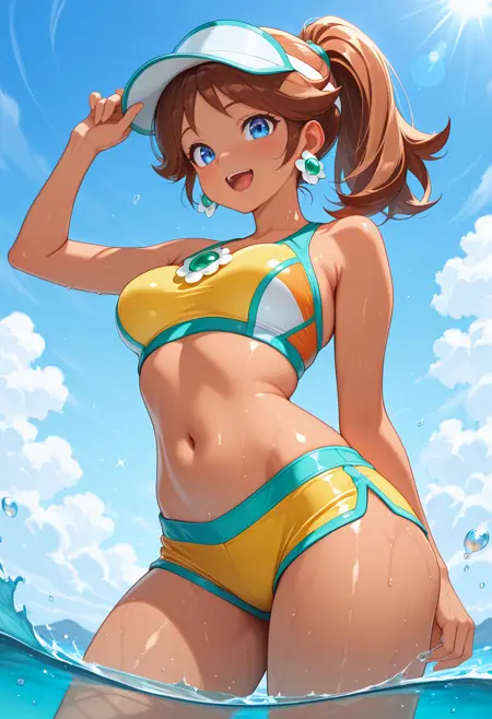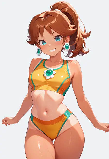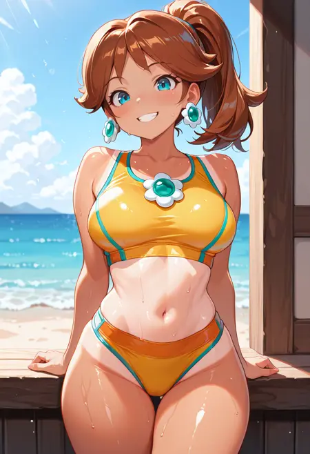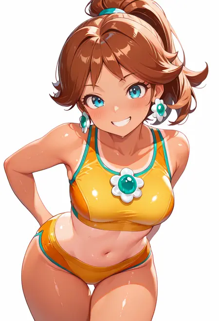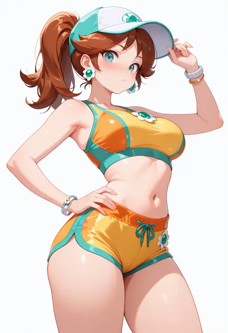 princess_daisy_(swimwear), 1girl, brown hair, jewelry, flower earrings, sports bra, shorts, blue eyes, hand on hip, ponytail, navel, hat, breasts, midriff, looking at viewer, bracelet, flower decal on hat,