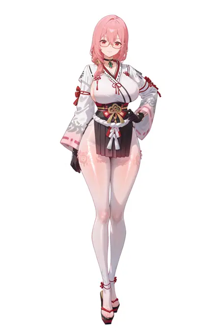 yanagi1,1girl,pink hair,long hair,red eyes,large breasts,red-framed eyewear,semi-rimless eyewear,choker,japanese clothes,black gloves,long sleeves,wide sleeves,obi,black skirt,white print pantyhose,geta,high heels,toenails,toes,