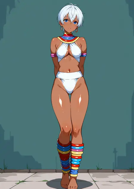 プロンプト: elena、日焼けした肌、カラフルなネックレス、カラフルなブレスレット、カラフルなアンクレット、白いクロスブラ、白い髪、短い髪、
