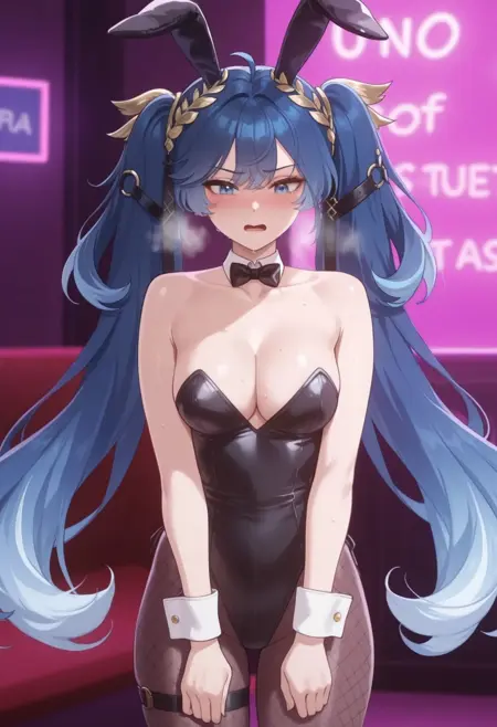 iuno wuthering waves, blue hair, blue eyes, medium breasts, streaked hair, multicolored hair, very long hair, twintails, hair belt, long hair, hair ornament, head wreath, <lora:wuthering_waves_iuno_illustrious:0.7>