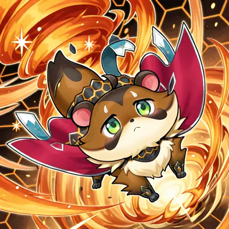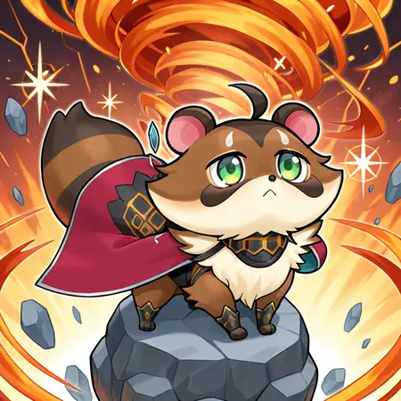 majes_raccoon,solo,多色の髪、アホ毛、緑の目、動物、尾、タヌキ、赤いマント、honeycomb(パターン)、火、竜巻、no humans、full body、