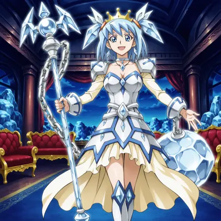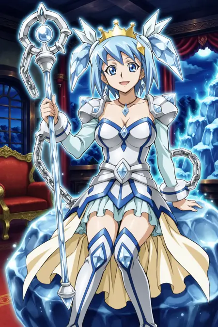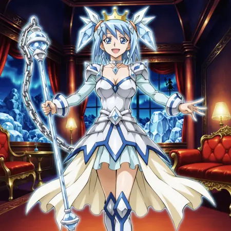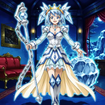 yugioh_card_style, yugioh_card_for_blizzard_princess, blue eyes, blue hair, short hair, diamond hair ornament, twin tail ribbon, earrings, necklace, large breasts, collarbone, cleavage, :d, gold crown, crystal-themed outfit, diamond motif dress, armored dress, princess armor, asymmetrical skirt, layered skirt, long sleeves, blue gemstone belt, diamond-shaped details, chest crystal gem, white thigh-high boots, staff and chained oversized gem