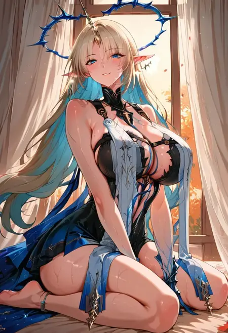 | トレーニングワード | Base: Fleurdelys, blonde hair, long hair, wavy hair, blue eyes, elf ears, pale skin, slim body, tall, large breasts, one horn, コピーしました! Outfit: Blue dress, fantasy armor, cleavage cutout, thigh straps,one metallic glove, shoulder armor, leather outfit, crystal accessories, asymmetrical design, glowing blue accents, blue ornaments, コピーしました! |