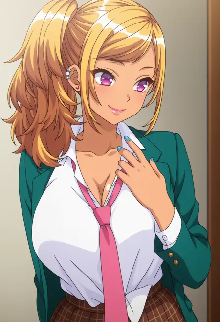 ruisa, 1girl, blonde hair, long hair, side ponytail, swept bangs, purple eyes, large breasts, dark-skinned female, pink lips, light blue nails, anime screencap, anime coloring,