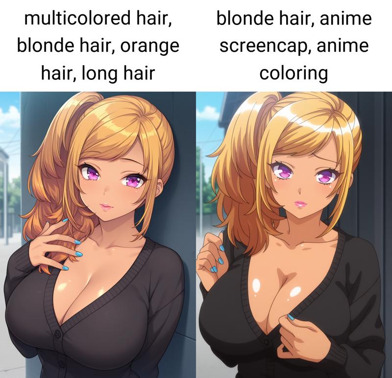 我来详细说明一下成人动画版本。露依的发色略有变化:在动画中她是金发,而在视觉小说中,她的头发除了金色外还带有橙色调。