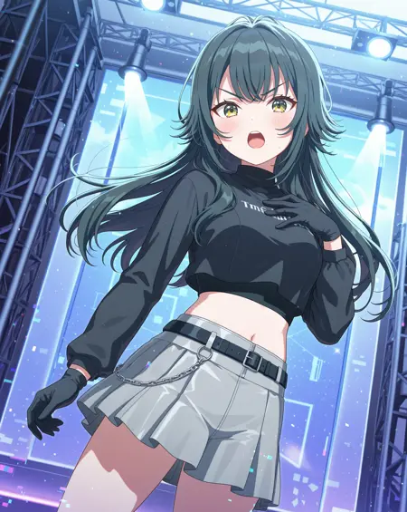 黑色舞台装(V2更新):长袖,黑裙,腰带,飘动的头发,黑色腰带,青色头发,腰带扣,蓬松长袖,