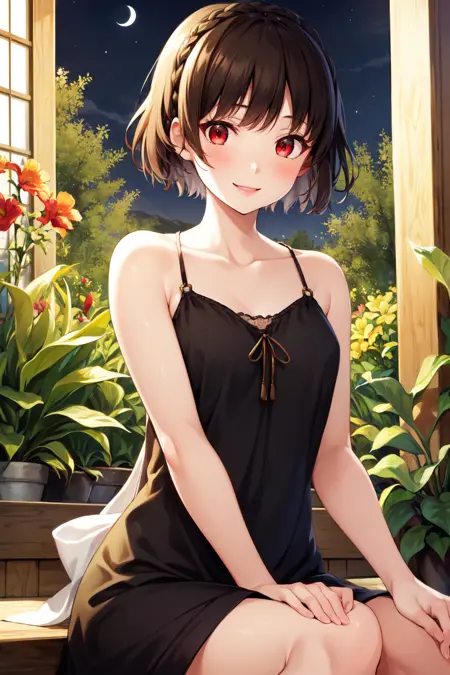 makop5d, niijimamakoto, smile, short hair, bangs, brown hair, red eyes, braid, crown braid