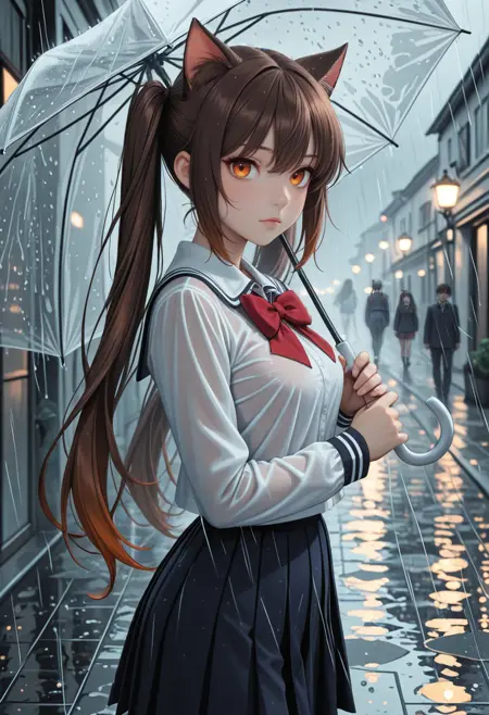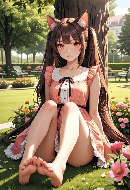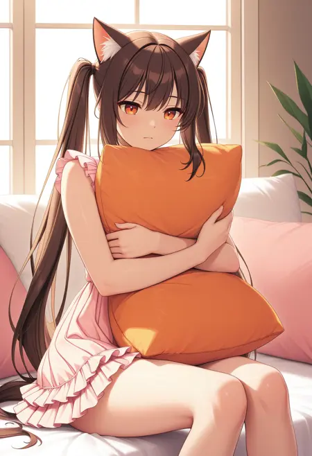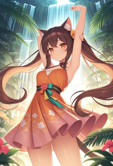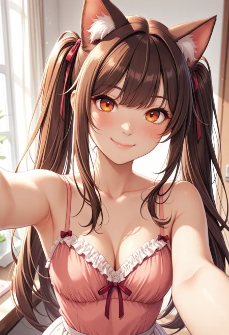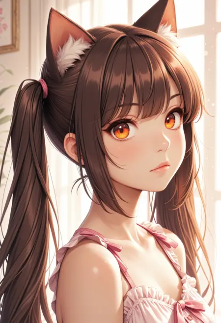 NPChocola, 1girl, brown hair, twintails, long hair, cat ears, orange eyes
