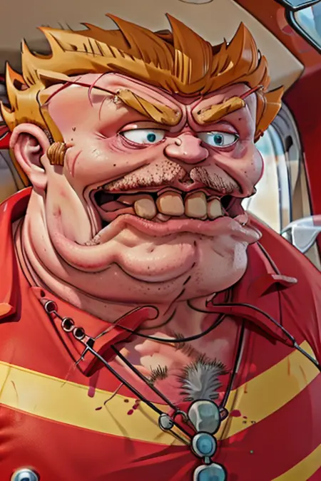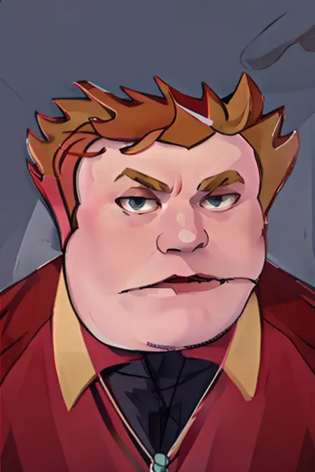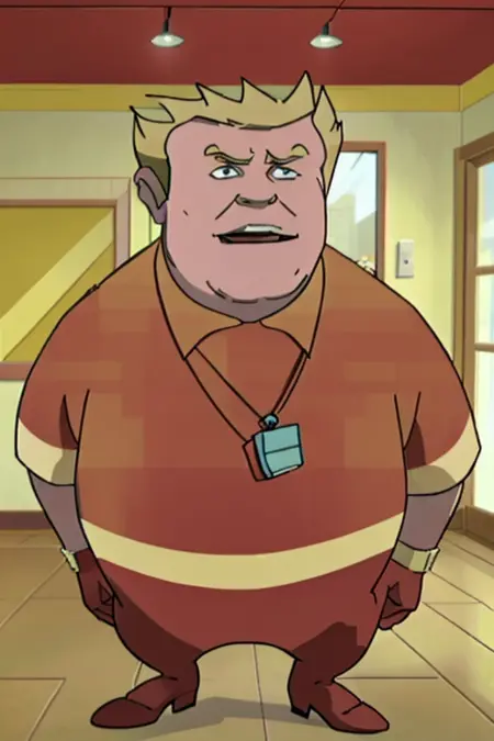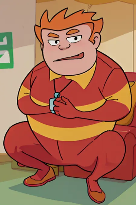 coach_john_mcguirk, orange hair, short hair, spiked hair, overweight, yellow collar, red shirt, whistle around neck, red gloves, yellow stripe, red pants, red shoes, mouth open, raised eyebrow,