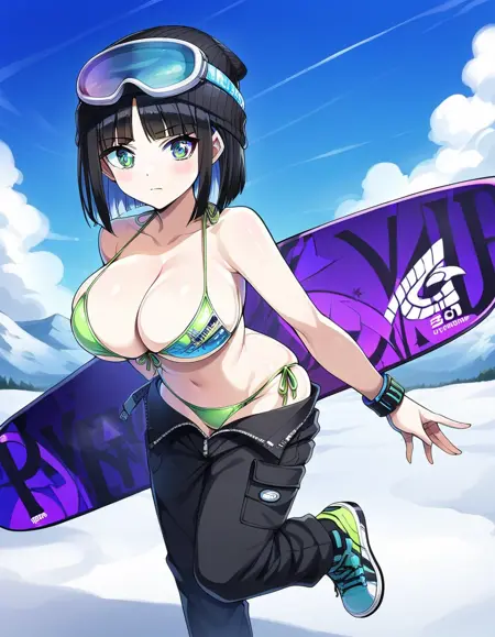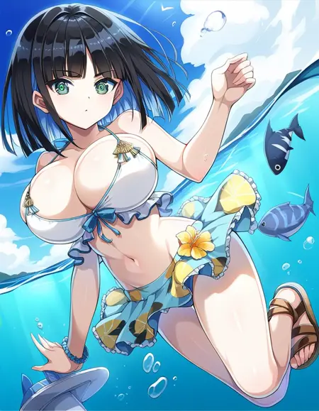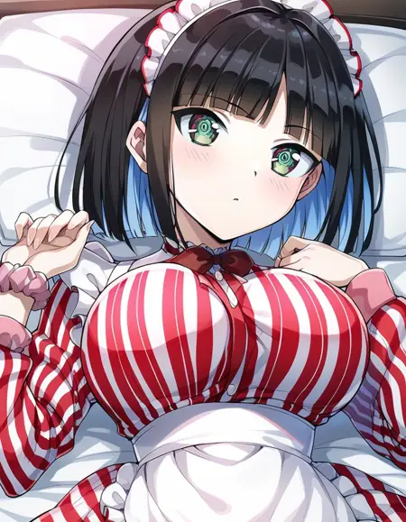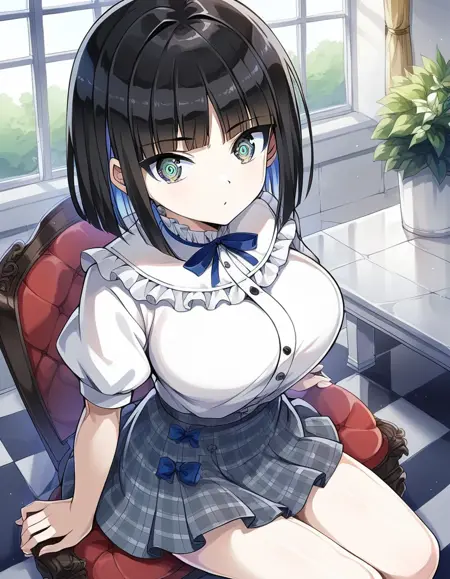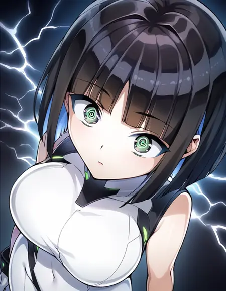 eines, crosshair pupils, black hair, short hair, bob cut, blunt bangs, colored inner hair, parted bangs, large breasts,