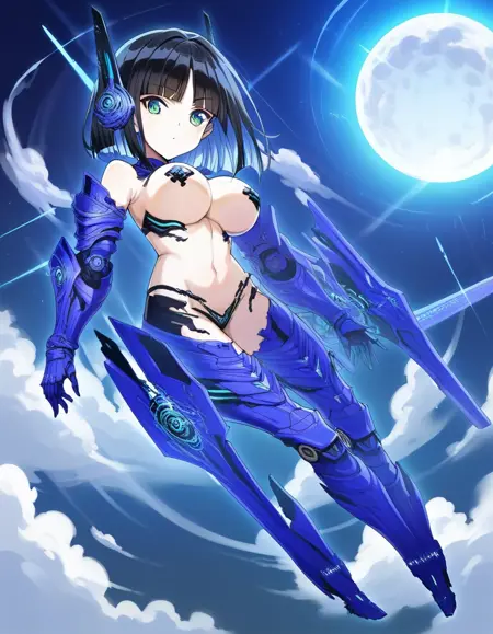 revealing clothes, bikini armor, mechanical ears, mechanical arms, mechanical legs, floating object, pasties, bare shoulders,