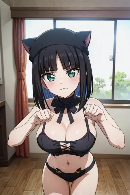 eines, crosshair pupils, black hair, short hair, bob cut, blunt bangs, colored inner hair, parted bangs, large breasts,