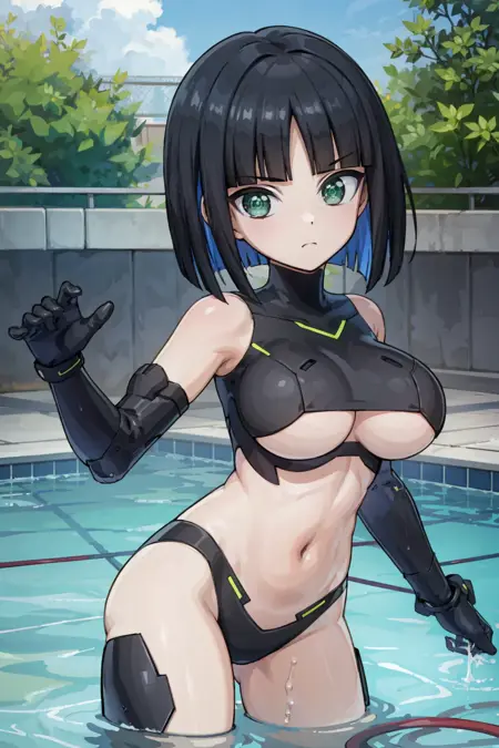 black swimsuit, underboob cutout, crop top, thigh boots, elbow gloves, midriff, navel, bare shoulders,